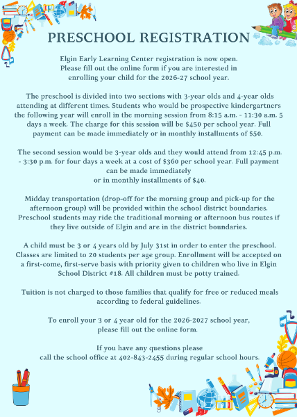 Elgin Public School Preschool & Kindergarten Registration is now open for the 2026-2027 school year! ๐Ÿฆ…๐Ÿงก๐Ÿ–ค